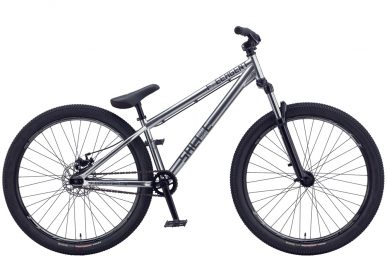 Frame: KHS Hi-Ten Jumping • Fork: VAXA 595S AMS 100mm, Dual Coil • Handlebar: Alloy Riser, 760mm x 30mm x 31.8mm • Stem: Alloy Forged Jumper • Crankset: F.A. 3-pc Hollow CrMo, 175mm, 28T • BB: Mid Cartridge Bearings, 8-Spline • Chain: KMC Z1 • Pedals: Wellgo Platform • Rims: Weinmann U32 Disc, Double Wall • Hubset: Alloy Disc Nutted 14T F/W • Tires: Kenda Small Block 8, FT: 26×2.35 RR: 2.1 30TPI • Brake Levers: Tektro ML-520 Alloy, 2F • Brakes: Bengal MB-606 Cable Disc, 160mm Rotor • Saddle: F.A. Padded Jump w/Integrated Post • Color: Bright Silver